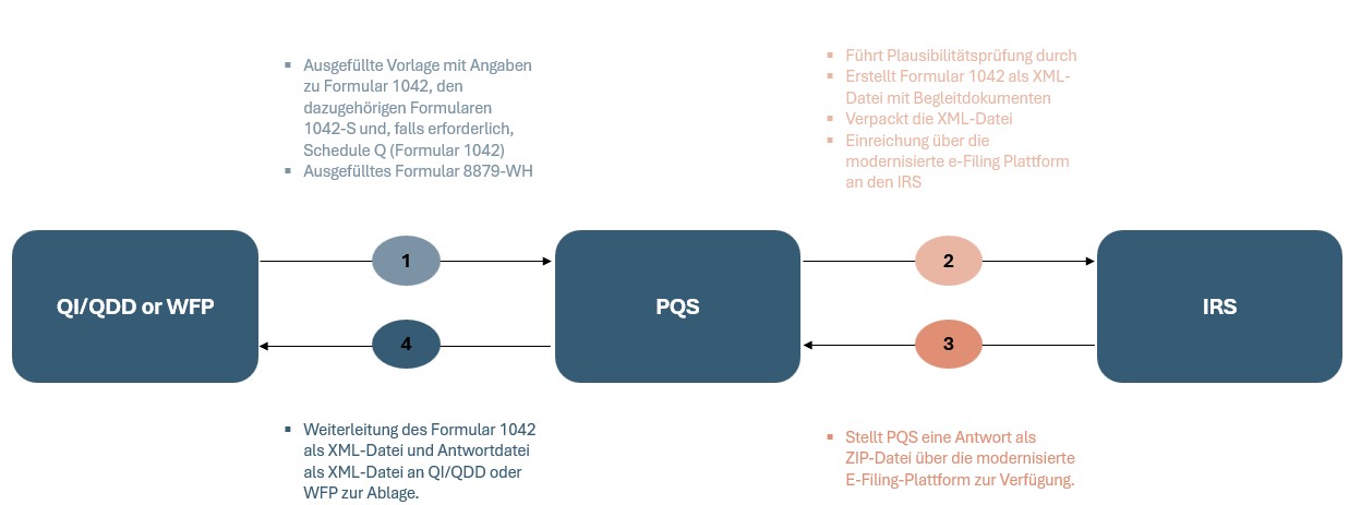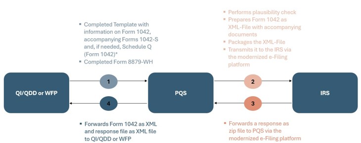 PQS hat den Status eines Electronic Return Originator and Transmitter (elektronischer Ersteller und Übermittler von Steuererklärungen) beim IRS erlangt und kann QIs, QDDs, US-Withholding Agent und WFPs bei der Erstellung des Formulars 1042, Schedule Q (Formular 1042), die begleitenden Formulare 1042-S (zum Nachweis der in Zeile 67 des Formulars 1042 geltend gemachten Steuergutschrift) und das Formular 7004 im richtigen Format zu erstellen und im Namen des Einreichers beim IRS einzureichen.