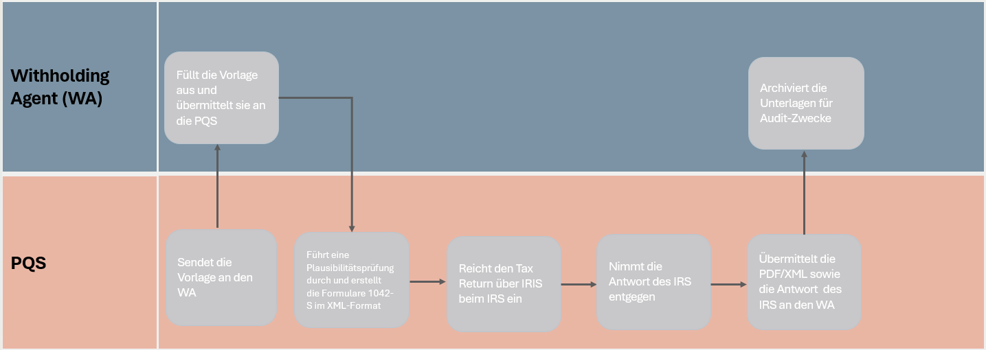 Aufgrund der bevorstehenden Änderungen bei den elektronischen Einreichungspflichten für die Formulare 1042-S und 1099 hat PQS den Status als Transmitter sowie Software Developer beim IRS beantragt und erhalten und ist nun in der Lage, diese Formulare über das Information Returns Intake System („IRIS“) einzureichen. In dieser Funktion kann PQS QI, QDD, WFP, WFT sowie andere Withholding Agents bei der Erfüllung ihrer Einreichungspflichten unterstützen und Anträge auf Fristverlängerung (Formular 8809) über IRIS übermitteln.