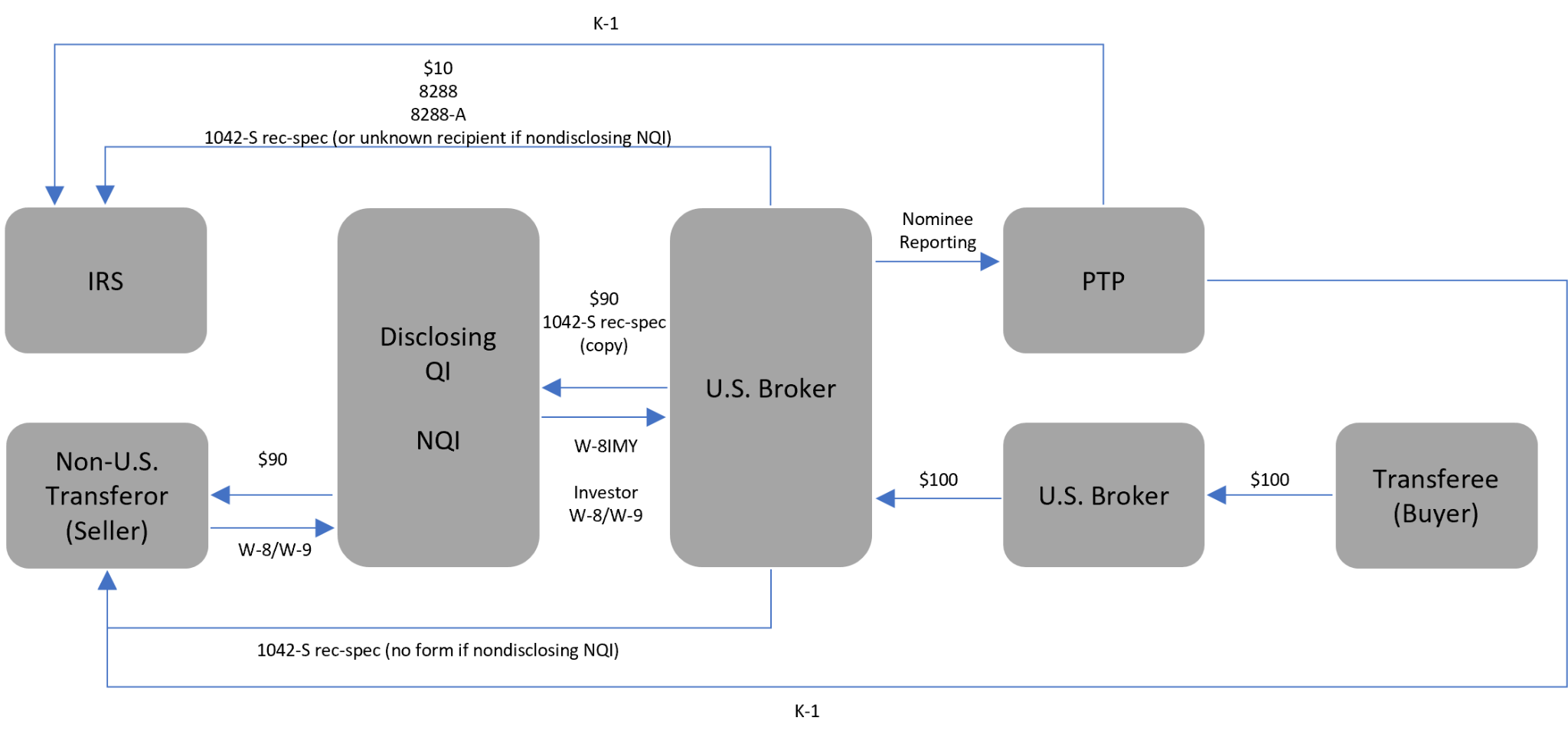 Der Broker eröffnet segregierte Konten bei der Depotstelle, dokumentiert sich selbst mit einem W-8IMY und einem Withholding Statement und legt für jedes segregierte Konto ein Formular W-8 (einschliesslich U.S. TIN) oder W-9 des Partners vor. Ein Disclosing QI hat im Allgemeinen keine Einbehaltungs- oder Meldepflichten nach Section 1446(f). Die Einbehaltung der Steuer auf realisierte Beträge erfolgt gemäss der für den zugrundeliegenden Investor vorgelegten Dokumentation und das Reporting (Formulare 1042-S oder 1099) wird durch den U.S. Withholding Agent direkt an den Investor ausgestellt.In PTP als Disclosing NQI investieren